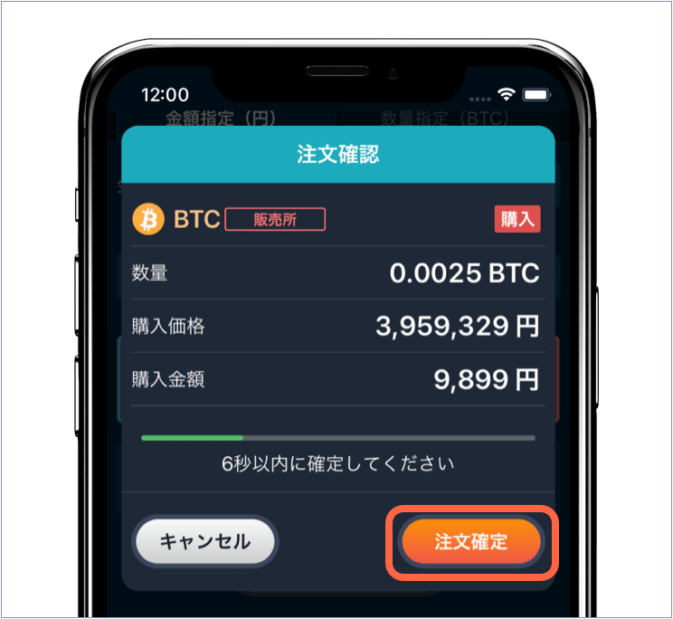 表示内容を確認の上、誤り等なければ6秒以内に[注文確定]をタップします。