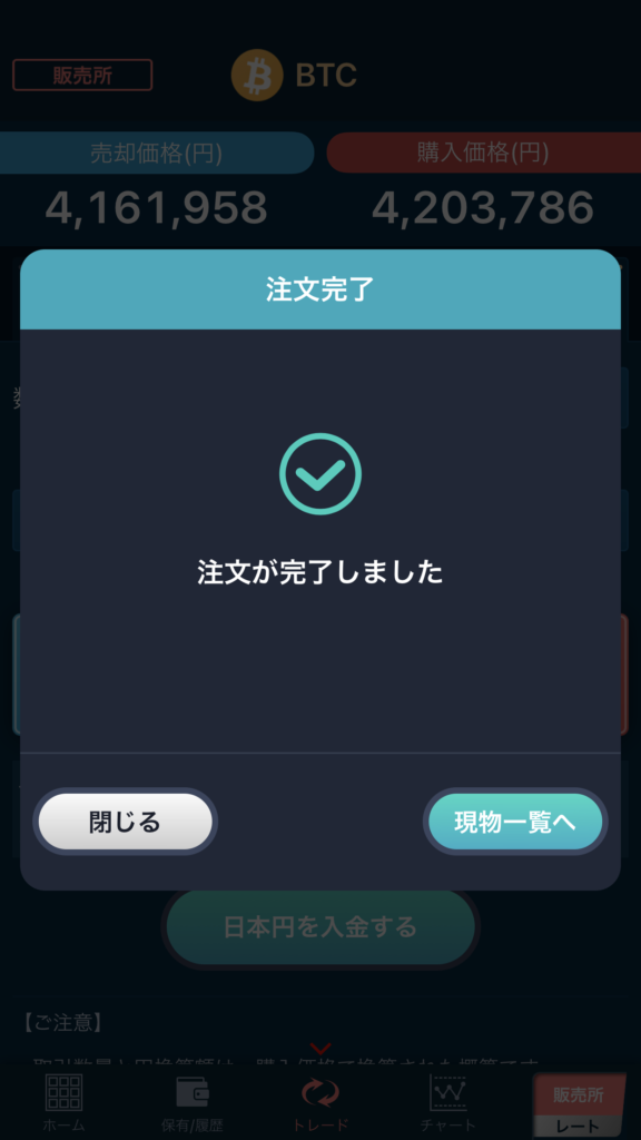 以上でビットコイン(BTC)の購入は完了です。