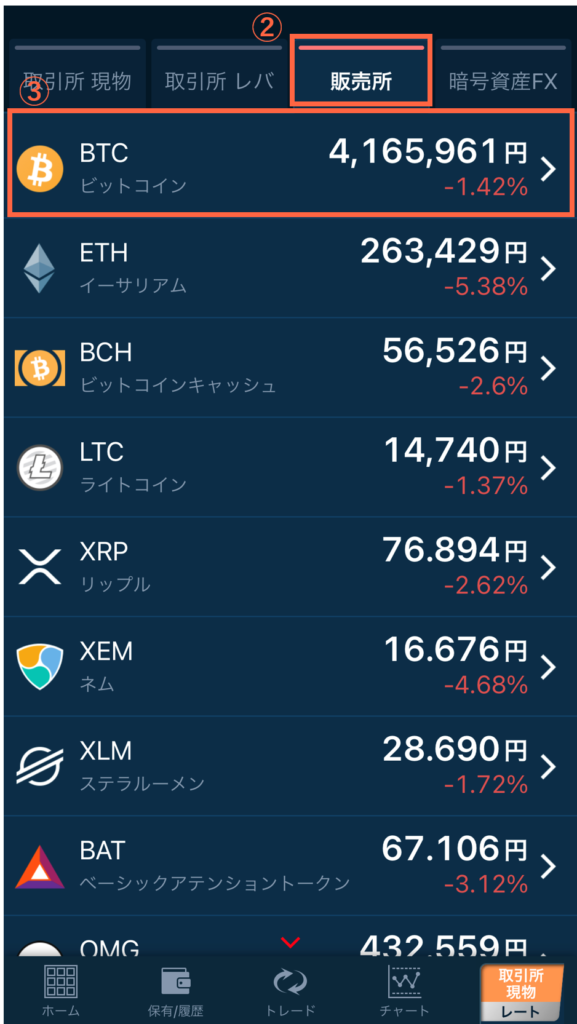 取引をする暗号資産の銘柄をタップします。