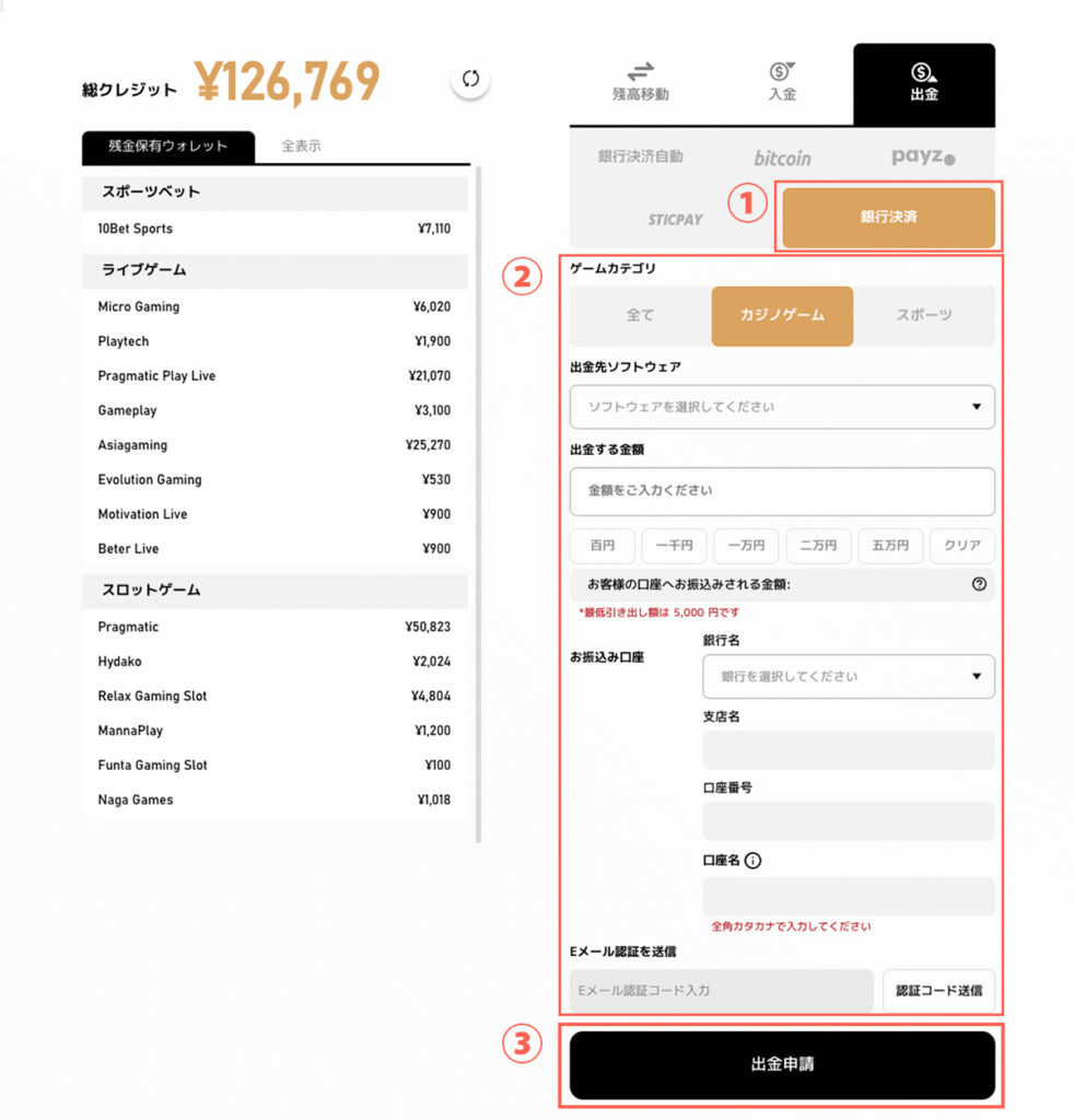 画面右側に表示される【出金】から【銀行決済】を選択し、必要情報をご記入ください。 【ゲームカテゴリ】指定するゲームカテゴリをご選択ください。