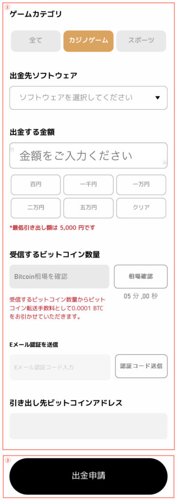 【引き出し先ビットコインアドレス】:ご自身のビットコインアドレスを記入