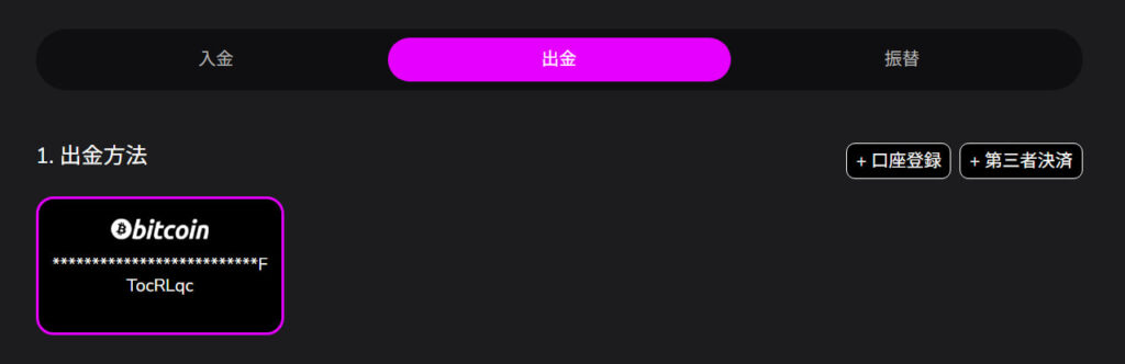 第三者決済の口座登録が完了しますと、画像のように出金を選択した際に、ご自身の口座を選択できるようになります。