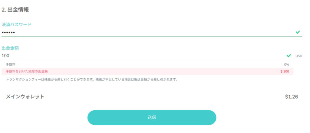 ご設定の決済パスワードと出金額を記入して「送信」をクリックしましょう。