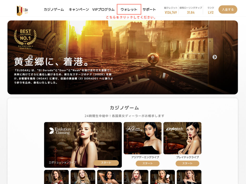 TOPページ上部にある【ウォレット】ボタンをクリックしてください。
